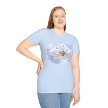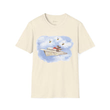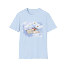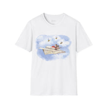 Mouse Flying Paper Plane T-Shirt, Unisex Soft-Style Tee with Bees in Blue Sky & Clouds, 100% Cotton, Lightweight, Durable
